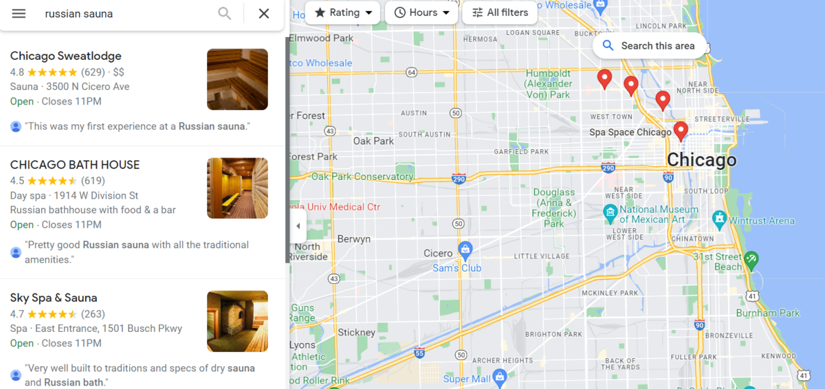 お目当てのバーニャを見つける難易度は意外と高く、単にChicago SaunaとかでGoogle検索しても、サウナ業者やマッサージメインの小規模施設が出てきたりします。Googleではなく、Google mapで"Russian sauna"と検索するのをおすすめします。以下注意点。